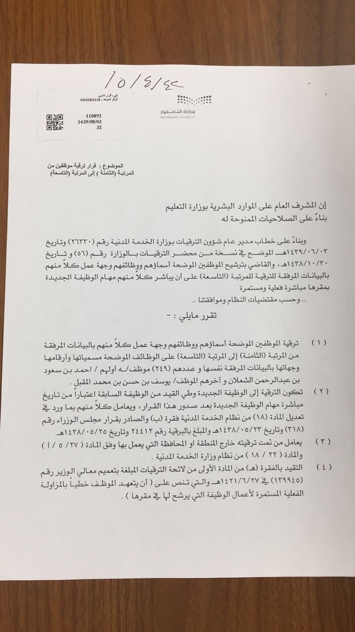 منصور الجربوع בטוויטר صدر قرار المشرف العام على الموارد البشرية بوزارة التعليم بترقية عدد 249 موظف وموظفة من المرتبة الثامنة الى التاسعة Https T Co F2mxat5swa